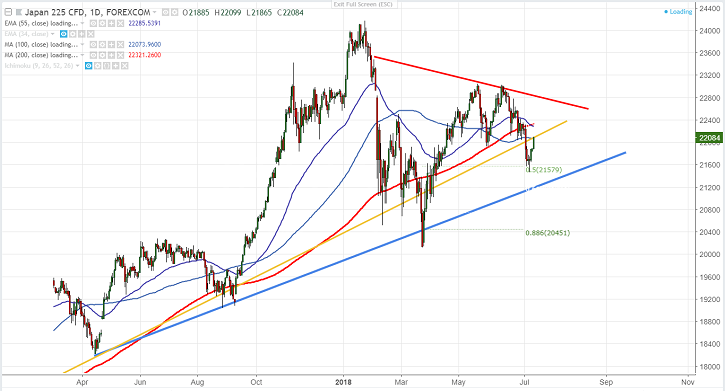 - Asian markets are trading higher almost more than 1% on better than expected US Non Farm Payroll data. US economy has added 213000 jobs in the month of June compared to forecast of 195000. Unemployment rate remains steady at 3.8% but wage growth came at 2.7% slightly below expectations of 2.8%. Chinese market has halted its weakness and has jumped more than 1.5% higher.Shanghai composite is trading around 2791.US markets closed sightly on the higher side with Dow Jones at 24456 (0.40% higher) and S&P500 2759 (0.85% higher).USD/JPY which is the main indicator of geo political tension is trading flat after hitting high of 111.13. US futures is trading marginally higher with Dow Jones at 24590 (0.50% higher) and S&P500 2739 (0.39% higher). Nikkei is currently trading around 22030 0.80% higher.