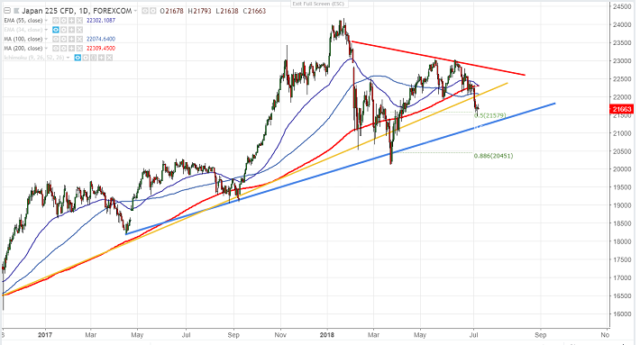 - Asian markets are trading slightly lower as US to impose tariff on China with from today night.Nikkei has shown a minor recovery today as US-European union may suspend auto tariffs.Automakers in Japan recovered after this especailly Honda up 1.70% and Toyota 1.71% higher. Chinese market is continuing its weakness for sixth week and has lost more than 1% for the day .It is trading around 2703.US markets closed slighty on the higher side with Dow jones at 24356 (0.75% higher) and S&P500 2736 (0.80% higher).USD/JPY which is the main indicator of geo political tension has recovered almost 50 pips from the low of 110.28.US futures is trading marginally lower with Dow Jones at 24312 (0.19% lower) and S&P500 2733 (0.09% lower). Nikkei is currently trading around 21650 0.15% lower.