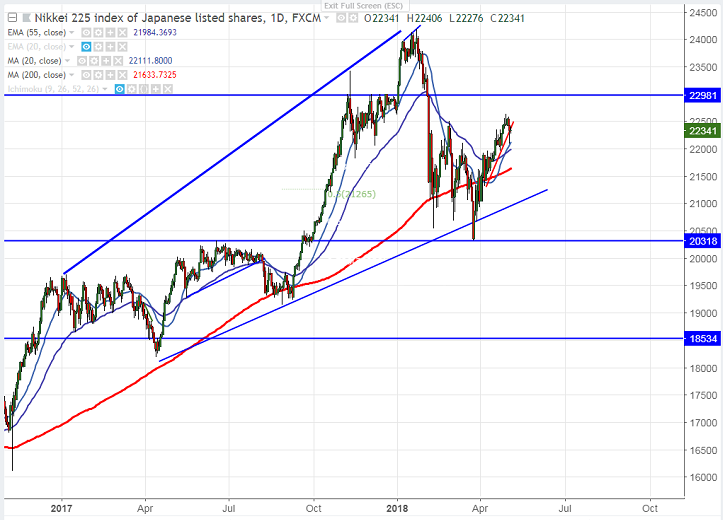 - Nikkei recovered more than 1.5% from yesterday’s low of 22090 on account of slight recovery in US markets. US markets closed slightly lower yesterday after massive recovery of more than 1.5% with Dow jones 23930 (0.02% higher) and S&P500 2629 (0.23% lower). US futures is trading slightly negative with Dow jones at 23928 (0.11% lower) and S&P500 2626 (0.14% lower). It is currently trading around 22316 0.02% higher.