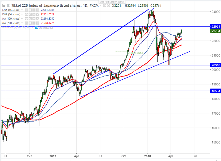 - Asian markets are trading positive after 1% jump in U.S markets yesterday. Tech and health care stocks drive more gains for US market. Asian markets following footsteps of US markets as slightly weaker than expected US inflation reduced the chance of drastic rates hike by Fed. US CPI rose 0.2% in the month of Apr compared to forecast of 0.3%.US stock indices has closed positive yesterday with Dow jones 24700 (0.80% higher) and S&P500 2716 (0.94% higher). US futures is trading marginally positive with Dow jones at 24755 (0.22% higher) and S&P500 2723 (0.19% higher). It is currently trading around 22486 0.97% higher.