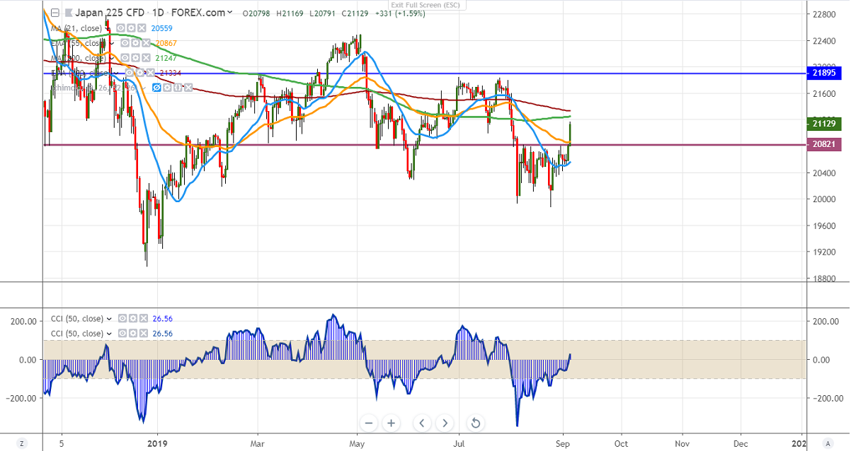 Technically Nikkei facing near term resistance around 21250-350 and any minor jump can be seen only if it closes above this level. Any close above targets 21500/22000.