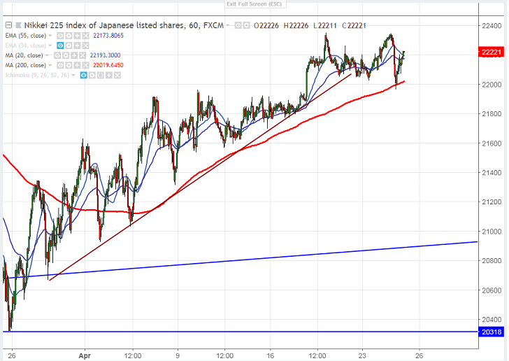 - Nikkei recovered more than 1% from yesterday low of 21996 on account of weak yen. The yen declined sharply against all majors on easing geo political tensions. US markets Dow jones and S&P500 has closed more than 1% lower due to rising US 10 year bond yield. US futures also continuing its weakness and is trading with Dow jones at 23930 (0.21% lower) and S&P500 2630 (0.2% lower).It is currently trading around 22272 0.63% higher.