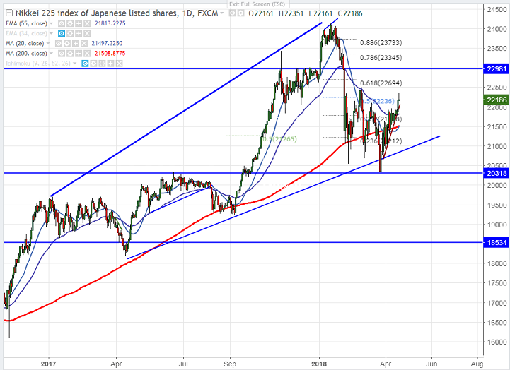 - Nikkei hits one month high on account of positive global cues and shown a minor profit booking. The index rose more than 2% from yesterday’s low. US markets Dow jones and S&P500 has closed flat after two days of bullishness. US futures continuing its range bound trade and is trading with Dow jones at 24748 (0.16% lower) and S&P500 2708 (0.02%).It is currently trading around 22211 0.23% higher.