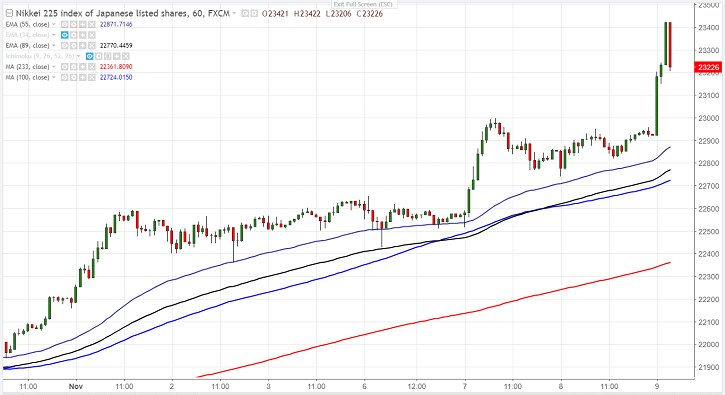 - Nikkei continuing its winning streak and hits highest level since 1992 at 23423 on account of strong corporate earnings and weak yen. The index has jumped almost 10% since Oct 23rd after Abe land slide victory . It is currently trading around 23243 1.4% higher.