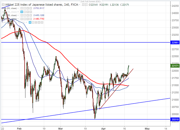 - Nikkei opened flat and shown a good jump in Asian session on account of positive global cues. The index jumped more than 250 points from the today’s open. US markets Dow jones and S&P500 has closed almost 1% higher yesterday on earnings hopes and easing geopolitical tensions in Korea. US futures continuing its yesterday bullishness and is trading slightly higher with Dow jones at 24815 (0.3% higher) and S&P500 2712 (0.22%).It is currently trading around 22186 1.37% higher.