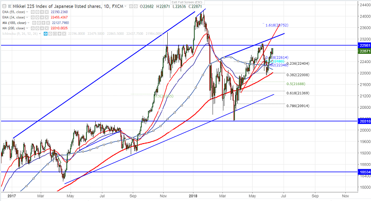 - Asian markets were trading slightly higher on account of meeting between Donald Trump and Kim Jong Un. Nikkei jumped almost 300 points in previous week on account strong global cues and positive US markets. The highlight of this weekend was G7 meeting. All G7 leader seemed to endorse a common communique. But comments from Canadian PM Justin Trudeau said in press conference that Canada would impose tariffs on US imported goods on Jul 1st 2018. Trump lashed out Canada’s PM in twitter saying that “very dishonest and weak” and also threatened to impose tariffs on automobile. US markets have closed slightly higher on Friday with Dow Jones 25316 (0.30% higher) and S&P500 2779 (0.31% higher). US futures is trading flat with Dow Jones at 25307 (0.04% higher) and S&P500 2775 (0.04% lower).Nikkei is currently trading around 22836 0.66% higher.