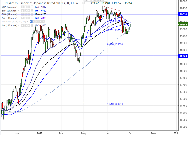 - Nikkei has shown huge rebound after hitting 4- month low at 19144 on Aug 28th 2017 after North Korea fears eased. The index recovered till 19681 at the time of writing. The slight jump in Nikkei was also due to slight weakness in yen. It is currently trading around 19656 0.46% higher.