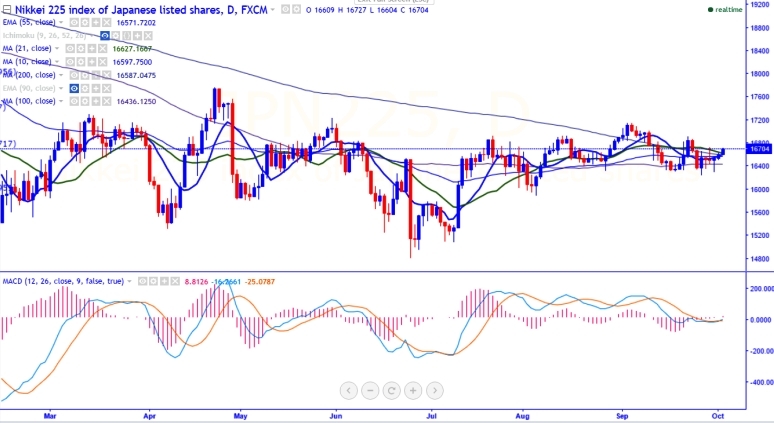 - The index has broken major resistance at 16705 (daily Kijun-Sen) and a slight jump till 16835/17000 is possible.