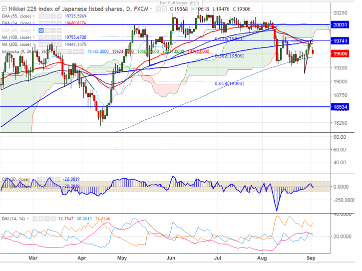 - The near term resistance of Nikkei is around 19745 (100- day MA) and break above will take the index to 19798 (cloud bottom)/20000/20319 (Jun 20th 2017).Short term bullish invalidation only below 19145.