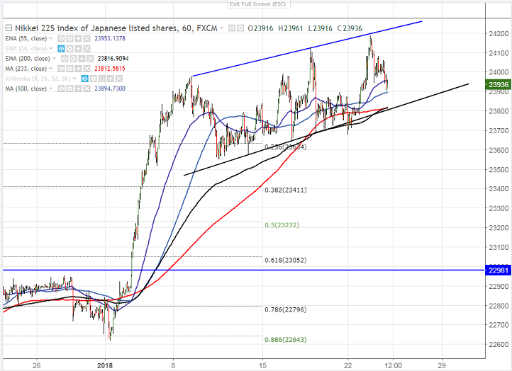 - Nikkei has shown a minor decline after hitting high of 24122 yesterday. The major reason for slight decline was due to slight bullishness in yen. US S&P 500 and NASDAQ finish records as technology shares leading the way following strong earnings from Netflix. It is currently trading around 23956 0.25% lower.
