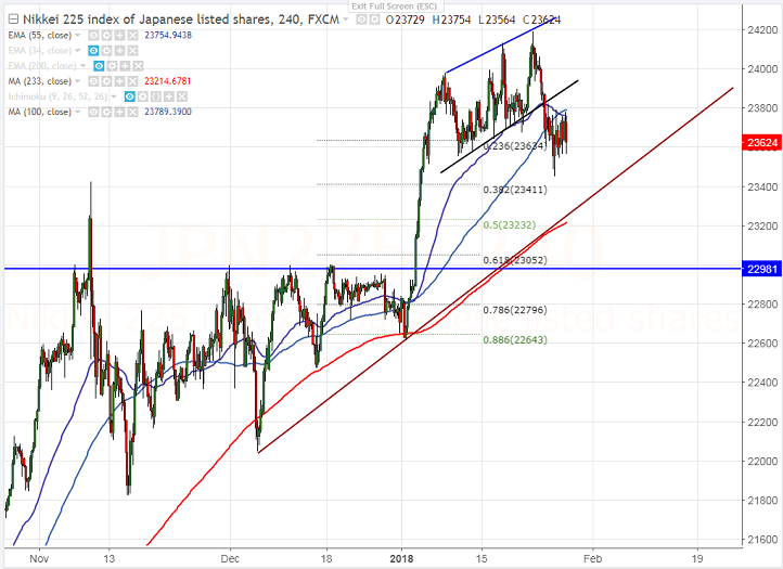 - Nikkei has shown a minor decline of almost 500 points from temporary top around 24187. The major reason for slight decline was due to huge sell off in USD/JPY pair. US Dow and S&P 500 hits record high at 26699 and 2876 respectively. It is currently trading around 23656 0.40% lower.