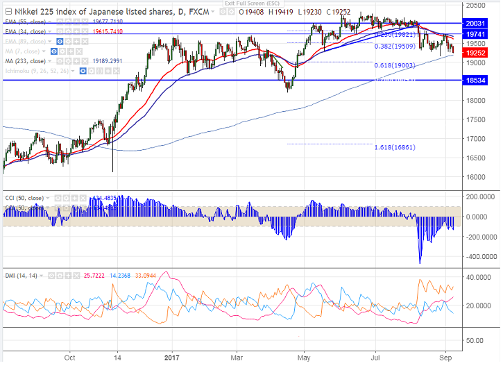 - The Japanese shares is declining from Aug 29th after the North Korea missile launch followed by nuclear test on Sep 3rd 2017. Nikkei is currently trading around 19252 0.80% lower.
