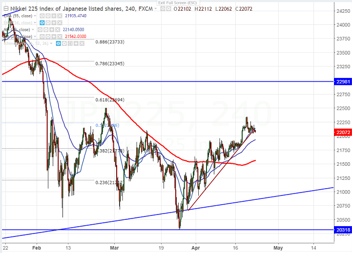 - Nikkei is trading slightly lower following footsteps of US markets. The index declined more than 1% from the recent high of 22351. US markets Dow jones and S&P500 has closed marginally weaker around 0.80%. US futures recovered marginally from yesterday’s low and is trading with Dow jones at 24536 (0.28%) and S&P500 2679 (0.28% higher).It is currently trading around 22062 0.05% higher.