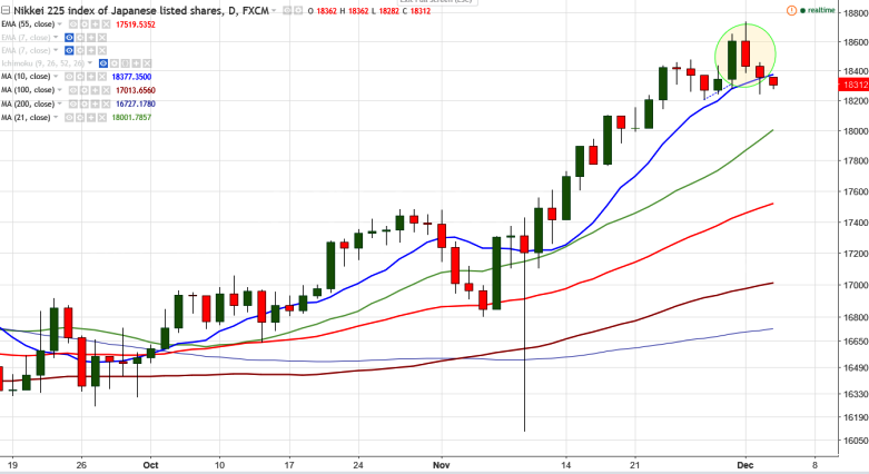 Nikkei225 declined sharply after making a temporary top around at 18742 on Thursday after Italy PM resigns after a clear referendum defeat. It is currently trading at 18302 0.33% lower.