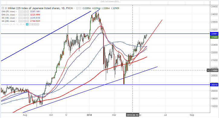 - Asian markets are trading flat as market eyes US-China trade talks in U.S markets yesterday. US and China launch a second round of trade talks on Thursday to avert trade tariff war. Trump admin sought $200 billion reduction in China’s $375 trade surplus. Dow jones 24714 (0.22% lower) and S&P500 2720 (0.09% lower) closed marginally lower. US futures is trading marginally positive with Dow jones at 24714 (0.23% higher) and S&P500 2724 (0.19% higher). It is currently trading around 22919 0.11% higher.