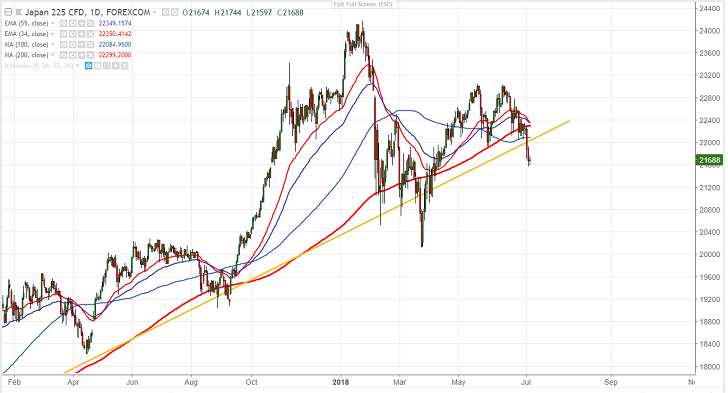 - Asian markets are trading lower especially Nikkei trading near 3- month low as the tariff deadline looms. Most of the investors fear that Washington will go ahead with plans of imposing tariffs on $34 billion worth of Chinese goods on Jul 6th 2018. Chinese yuan is trading near 11-month low and Shanghai composite is continuing its bearish trend. The index has lost 0.87% and is currently trading around 2764. Japanese markets decline was mainly due to decline in tech related shares as Micron largest chip maker lost more than 5% yesterday. US markets closed slightly flat with Dow Jones 24174 (0.54% lower) and S&P500 2713 (0.49% lower).USD/JPY which is the main indicator of geo political tension has shown a minor selling from the high of 111.13.US futures is trading marginally positive with Dow Jones at 242288 (0.18% higher) and S&P500 2716 (0.20% higher). Nikkei is currently trading around 21690 0.08% higher.