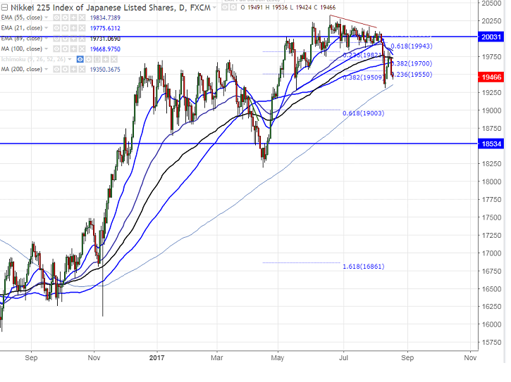 - Nikkei has declined after hitting high of 19835 on Aug 15th 2017. The index has shown a minor selling from the high on account of global equities sell off strong yen. The index has declined till 19425 and is currently trading around 19456 0.18% lower.