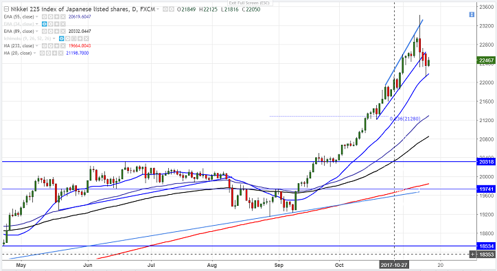 - Nikkei has shown a minor pullback after hitting low of 22106. The index hits 25- year high at 23423 and declined almost 1300 points from the high on account of profit booking and weak global markets. It is currently trading around 22465 0.49% higher.