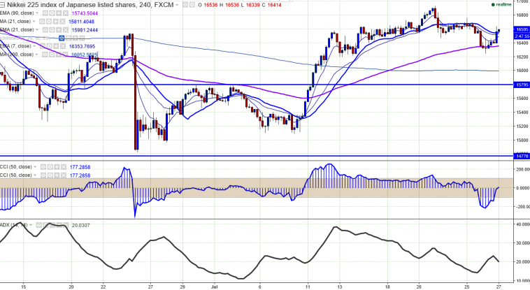 - Nikkei225 has broken major resistance 16586 and and jumped till 16605 at the time of writing .It is currently trading around 16354.