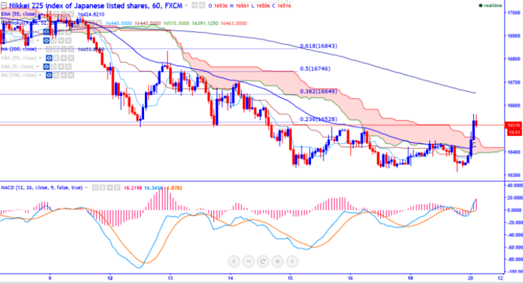 - Nikkei225 has recovered sharply after decling till 16316 at the time of writing.It is currently trading around 16511.