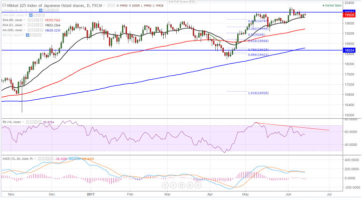- Nikkei has shown a minor sell off after hitting a high of 20228 on Jun 5th 2017 on account of Fed monetary policy meeting which is to be concluded tomorrow. It is currently trading around 19923.