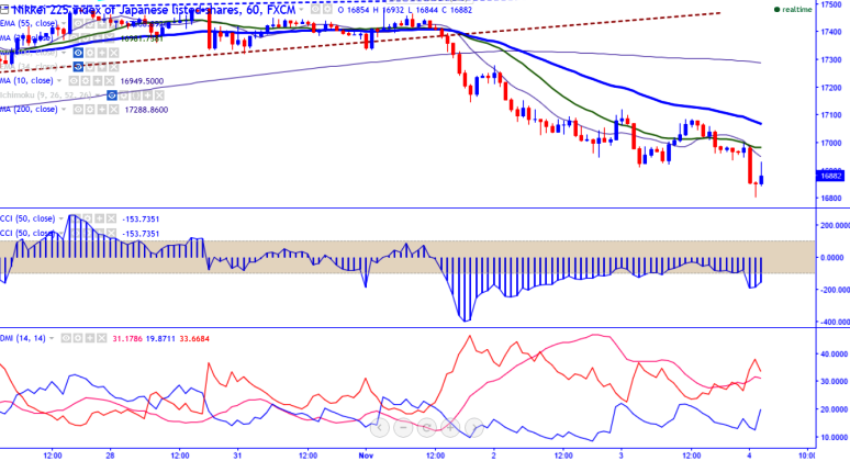 - Nikkei225 declines to two- and half week low on uncertainty over U.S election as continuously for the past two days on US elections uncertainties. The index tumbled 1.9% to 16803, the lowest till Oct 17th.