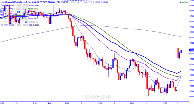 - Nikkei225 showed a gap up opening today morning after FBI gives clean chit to Hillary Clinton . The index rose 1.7% to 17184 at the time of writing from the low of 16804, the lowest till Oct 17th.