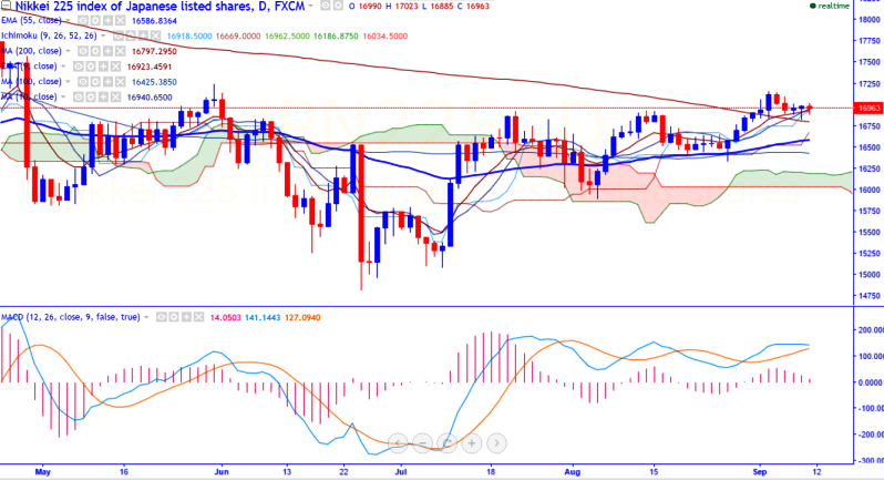 - Nikkei225 has once again recovered from 200- day MA till 17023 at the time of writing.It is currently trading around 16958.