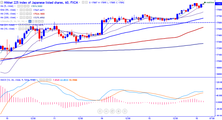 - Nikkei225 jumped sharply till 17900 on account of weak yen and slightly declined from that level.The index is still holding above 17500 and is currently trading at 17885 0.07% lower.