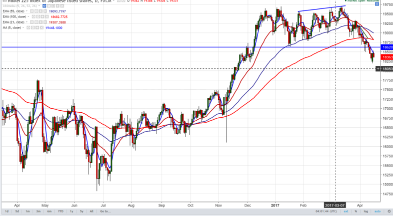 - Nikkei trades weak on account of stronger yen and geopolitical tension.Tension between Washington and Pyongyang has escalated in recent weeks.The index shown a minor recovery after making a low of 18197. It is currently trading around 18402 0.35 % lower.