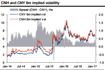 The options trades are preferable over forwards as the implied volatility is similar between CNH and CNY (CNH vol is 0.2 vol points higher than CNY vol in the 6m tenor) and the vol spread has been narrowing over time.