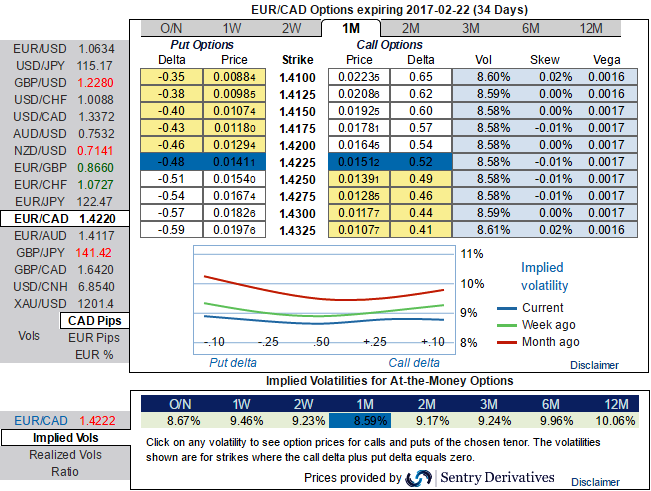 The execution: Initiate shorts in 1W (1.5%) out the money put with positive theta, simultaneously, buy 1M in the money -0.5 delta put option. Establish this option strategy if you expect that EURCAD would either expect sideways or spike up abruptly over the next near future but certainly not beyond your upper strikes.cen