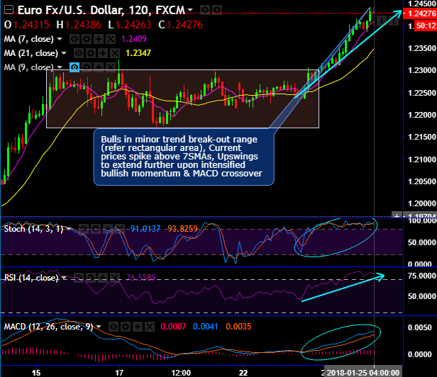 The minor trend of EURUSD manages to break-out above range (refer 4H chart in the rectangular area), consequently, the current prices have spiked above 7SMAs. For now, the upswings are most likely to extend further upon intensified bullish momentum & MACD crossover.
