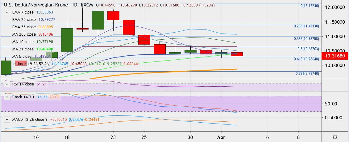 - Immediate resistance is located at 10.5658 (7-EMA), and close above could take it till 10.5903 / 10.6506.