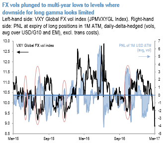 Last but not least, Dutch elections reassured the market that anti-EU populism was contained and well gauged by polls, at least in the Netherlands. This is leading to the sharpest drop in vols in years. The gauge of 3M USD vols, the VXY Global, has broken below 9 even accounting for French election risk, to levels usually associated with decent gamma performance (see above chart).
