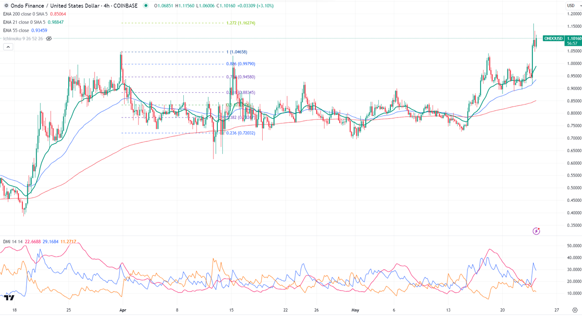 ONDOUSD gained more than 25% in the past two days. The pair holds well above the short-term (21 and 55 EMA) and below the long-term moving average (200-EMA) in the 4-hour chart. It hit a high of $1.165 and is currently trading around $1.1075.