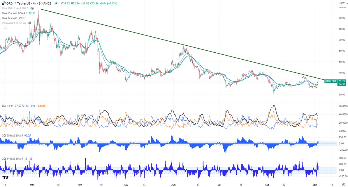 ORDIUSD gained more than 25% in the past two days. The pair holds well above the short-term (21 and 55 EMA) and the long-term moving average in 4-hour chart. It hit a high of $32.53 and is currently trading around $32.23.