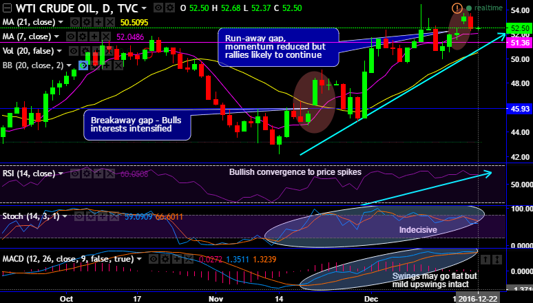 Hence, we don’t encourage long-term short build ups hereafter; instead, we encourage longs in WTI crude of mid-month expiries for targets of 54.48 levels with strict stop loss of 51.36 levels, thereby, the trade carries attractive risk reward ratio.
