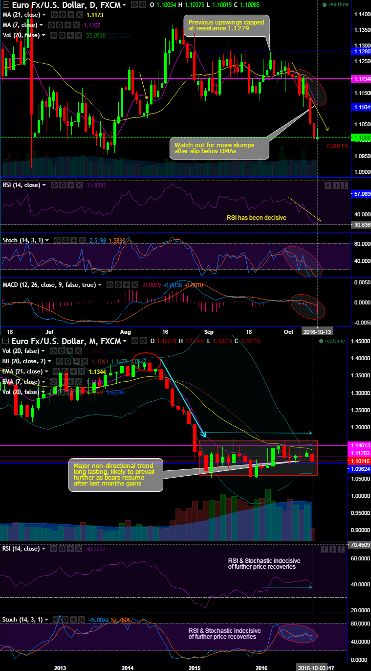 Long-term investors should be cautious, even if it holds the current levels, we see restricted upside potential at 21EMAs, at this juncture momentum in previous rallies likely to collapse; long term non-directional trend seems intact. Hence, in long run, we still project below cyclical lows 1.10 but between the range of 1.08-1.09 by the Q1'2017 end.