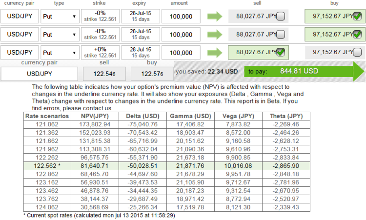 Delta prices and measures options strategy correctly: As shown in the figure it is observed that this strategy offers reliable delta (-50028.51) at prevailing exchange rate which means we are short on USDJPY in underlying market. So, we are participating in Yen as long as it holds its strength but when USD gains appreciation, delta responds proportionately (-25266.34) which means our shorts in underlying have reduced and we are also participating on upswings as well.