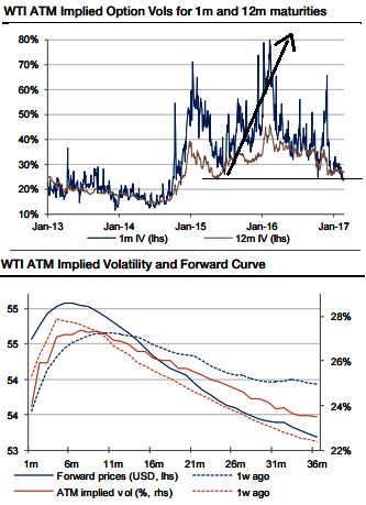 Crude oil implied volatilities (IVs) have been lingering under downward pressure, especially in short tenors. The WTI 1m ATM IVs have shrunk to about 23.8% which is the lowest level since October 2014 which was before the November 2014 OPEC meeting where OPEC decided against cutting production and instead let market prices adjust lower to balance the market.