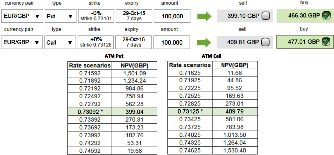NPV of ATM call - 409.79 while Premiums trading above 16.40% at GBP 477.01 for lot size 100,000 units.