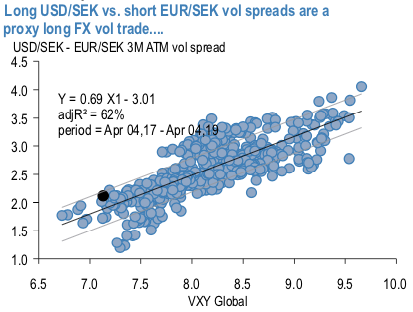 For those averse to any kind of vol ownership in the current climate, it may still be worth considering the short EURSEK leg of the RV above in limited risk format.