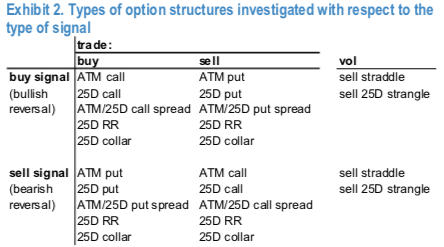 One further clarification is needed. Long/short designation in 2ndand 3rdcharts refers to 1) for “calls,” “call spreads,” “R/Rs,” and “collars,” the trades are long option structures on “buy” signal (bullish reversal) and short option structures on “sell” signal (bearish reversal), while 2) for “puts” and “put spreads,” the trades are long the structures on “sell” signals and short the structures on “buy” signals. Courtesy: JPM