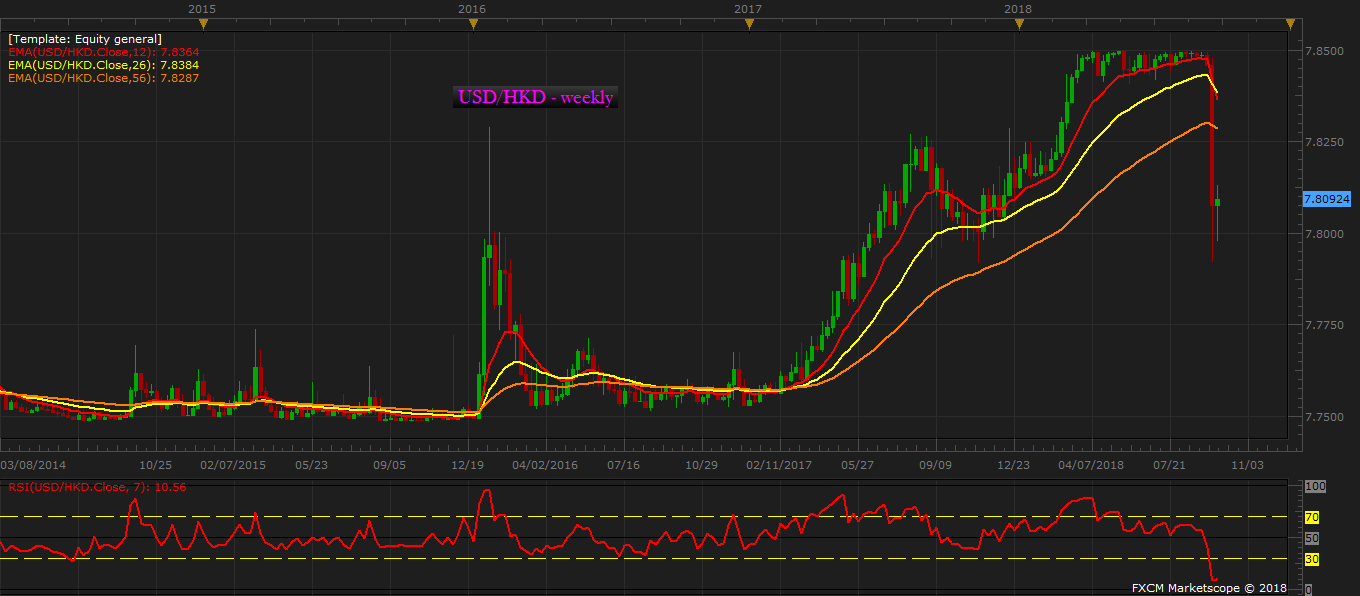 However, last week, for the first time since March, the pressure on the Hong Kong dollar on the lower bound (7.85) eased significantly with HKD strengthening to as high as 7.79 per USD. The exchange rate is currently trading at 7.81 per USD.