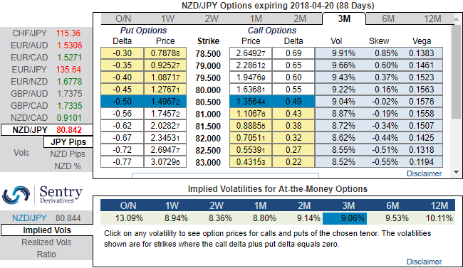 ATM IVs of NZDJPY is trading between 8.80% and 9.06% for 1m and 3m tenors respectively and positively skewed IVs of 3m tenors are evidencing bearish hedging interests. Bids for OTM puts upto 78.50 is noticeable to signify downside risks.