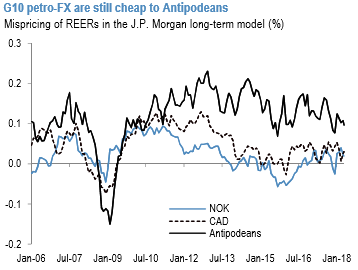 Hence, this suggests that while CAD has strengthened by modestly more than that implied by the rise in oil prices, NOK has lagged. In any case, both NOK and CAD continue to be near fair value but cheap relative to the Antipodeans (refer above chart).