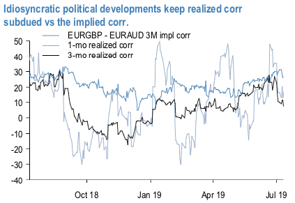 The currency differentiation and short correlation were laid out as one of the core vol alpha themes for H2 in the Mid-Year Outlook. One class of trades that were identified in there was selling GBP vs. commodity FX correlation on the view that GBP’s idiosyncratic political dynamics would lead to low / no correlation with other cyclically sensitive FX.