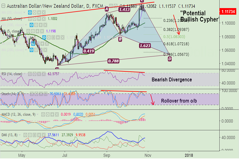 - We evidence a potential 'Bullish Cypher' pattern on the daily charts which raises scope for downside.