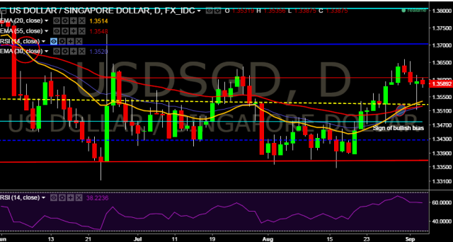 We prefer to go long on USD/SGD only above 1.3614 with stop loss at 1.3513 and target of 1.3799.